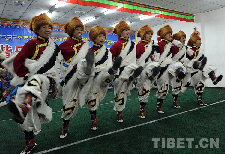 這是班戈縣諧欽民間藝術(shù)團的年輕舞蹈演員,在北京華北電力大學禮堂進行彩排時的劇照(唐召明2015年9月28日攝)