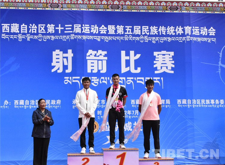 圖為7月29日,男子個人70米雙輪賽頒獎現(xiàn)場,中間為冠軍選手林芝市代表團(tuán)運(yùn)動員嘎瑪江村,其右為亞軍選手拉薩市代表團(tuán)運(yùn)動員瓊達(dá)次仁,其左為季軍選手教育代表團(tuán)運(yùn)動員旦增羅布 攝影:拉姆