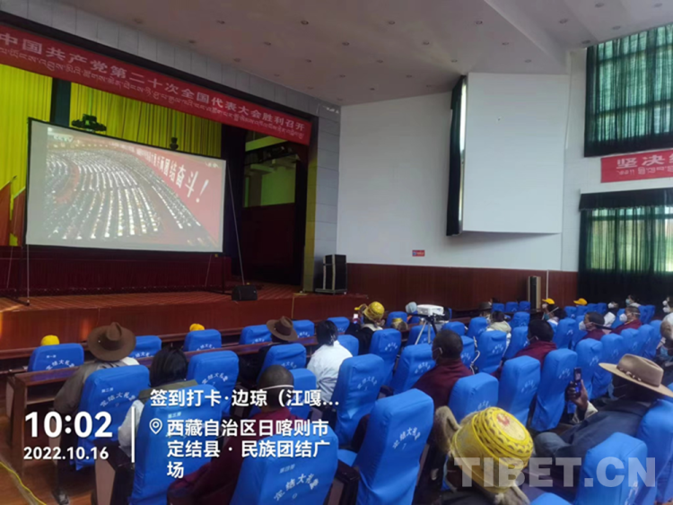 圖為10月16日上午,西藏自治區(qū)日喀則市定結(jié)縣各族干部群眾收看黨的二十大開幕會(huì)直播