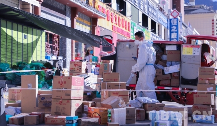 中國(guó)西藏網(wǎng)訊 隨著拉薩市疫情防控形勢(shì)整體持續(xù)向好,目前拉薩市郵政快遞業(yè)在落實(shí)好常態(tài)化疫情防控工作的基礎(chǔ)上,正有序復(fù)工復(fù)產(chǎn)。圖為快遞員無(wú)接觸配送快遞 攝影:賈華加(中國(guó)西藏網(wǎng) 記者/賈華加)