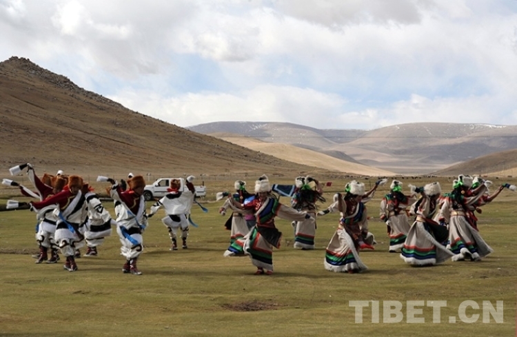 這是班戈縣諧欽民間藝術(shù)團的年輕舞蹈演員,在家鄉(xiāng)草原跳起歡快的“鍋莊”舞(唐召明2015年5月21日攝)