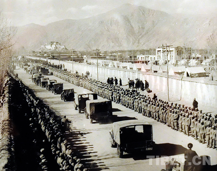 1954年12月25日,汽車第一次開進(jìn)拉薩。當(dāng)天,青藏、川藏公路正式通車,兩隊(duì)350多輛汽車披紅掛彩會師布達(dá)拉宮廣場(唐召明翻拍照片)