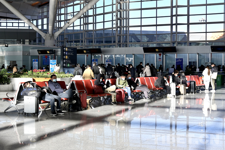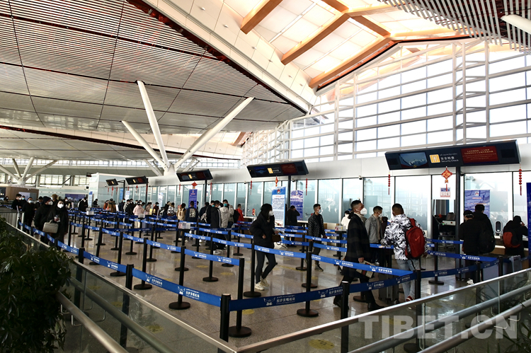 圖為春運首日拉薩貢嘎機場內(nèi)候機的旅客