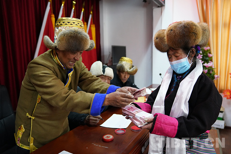 “普布達桑44565元、多吉扎西38750元、加央卓瑪2000元……”被叫到名字的村民和放牧員們紛紛上前領(lǐng)取入股后的第一次分紅。當(dāng)天牧場為12名放牧員和入股的102戶村民共發(fā)放了64.65萬元的薪資和分紅款。