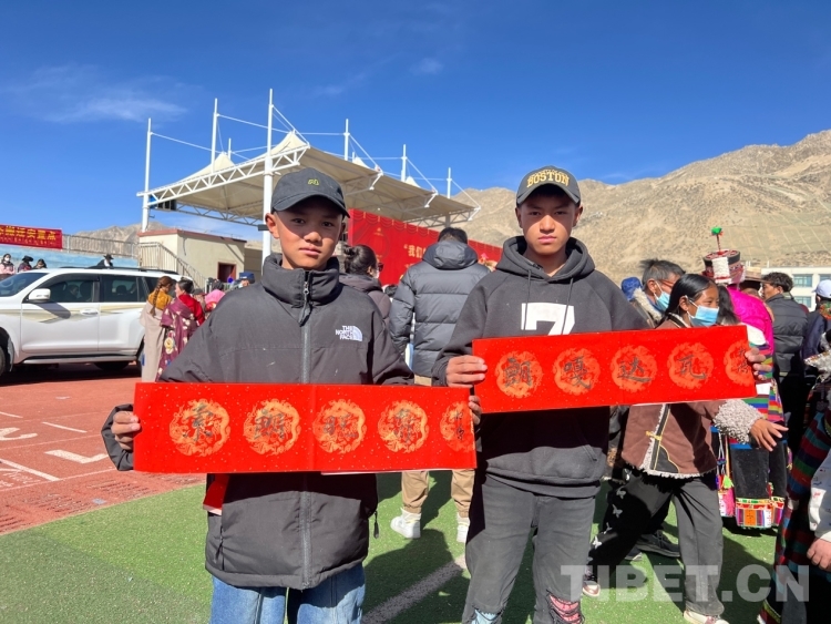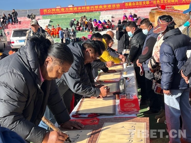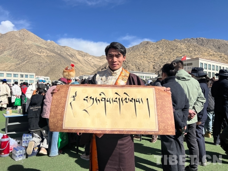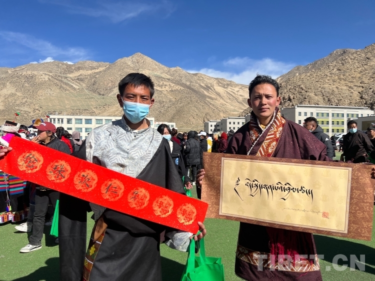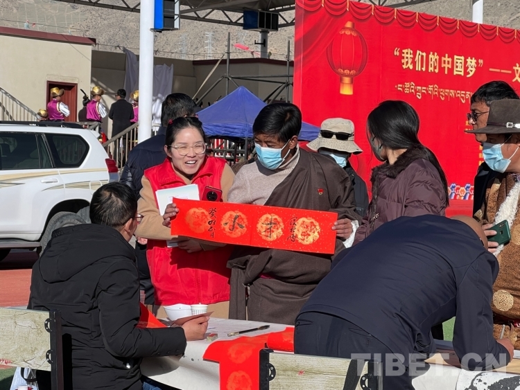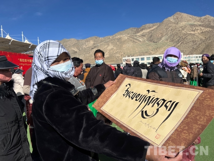 中國西藏網(wǎng)訊 2月16日,西藏自治區(qū)文聯(lián)主辦的“我們的中國夢”——文化進萬家活動在極高海拔生態(tài)搬遷安置點開展。在送“書法”現(xiàn)場,由西藏書法協(xié)會和山南市11位書法家為當(dāng)?shù)厝罕娝腿?00多張寓意美好的新年祝福和群眾期望的新年祝愿等。活動現(xiàn)場群眾絡(luò)繹不絕,大家心滿意足地拿著書法家為自己贈送的精美“禮品”。一旁書法家們忙碌地為群眾書寫祝詞,另一旁群眾們晾曬著他們得到的書法作品,一時間現(xiàn)場成了“書法展”,時不時地有人前來參觀欣賞。(中國西藏網(wǎng) 記者/德吉卓瑪)