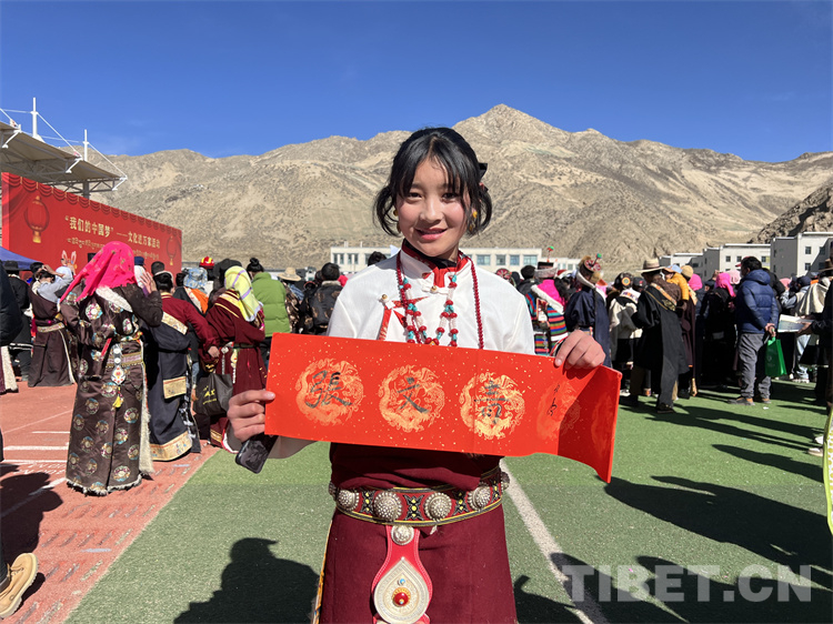 來到送“書法”現(xiàn)場,書法家們早早地來到活動現(xiàn)場,他們準(zhǔn)備筆墨、鋪開紙張,為現(xiàn)場群眾書寫藏、漢文新年對聯(lián),“?!弊帧ⅰ凹槿缫狻?、“扎西德勒”等寓意美好的祝福。書法家協(xié)會副主席祖牛拉巴次仁說:“從春節(jié)開始,我們書法家們?nèi)W(xué)校、社區(qū)、搬遷安置點(diǎn)等地,書寫了超過1萬件的書法作品。這些作品深受大家的喜愛,我們后續(xù)也會繼續(xù)開展送‘書法’公益活動”。現(xiàn)場群眾聚集在送“書法”現(xiàn)場,“西熱措姆”“張文青”“索朗旺青”“朗嘎達(dá)瓦”……孩子們爭先恐后請書法家把自己的名字寫在紅紙上?!斑@是我的名字,我爸是西寧人,我媽是那曲的,我們是從那曲安多縣搬遷過來的,我現(xiàn)在在森布日幸福中學(xué)上初三,將來要考那曲高級中學(xué)”張文青拿著書家贈給她的“名字”用流利的那曲話對記者說。