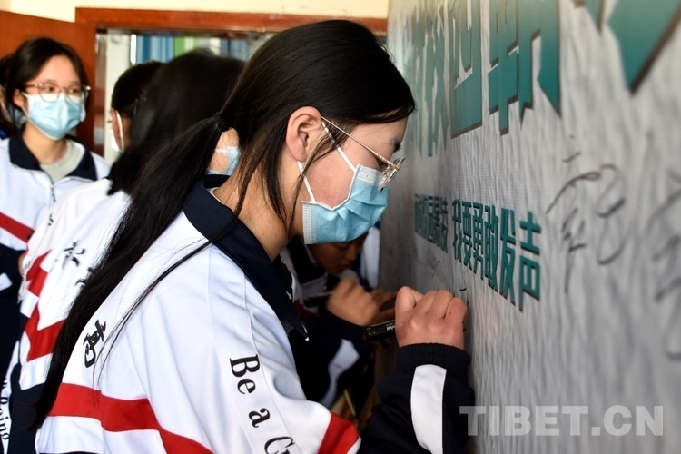 圖為學(xué)生們依次在面對(duì)校園霸凌我要勇敢發(fā)聲簽名墻進(jìn)行簽名 攝影:次旦拉姆