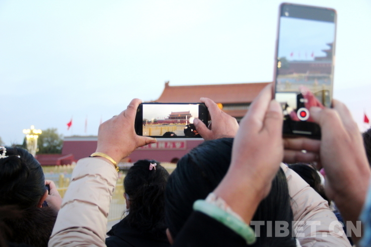 圖為“2023年西藏基層?jì)D聯(lián)干部赴京學(xué)習(xí)參觀團(tuán)”成員們紛紛用手機(jī)記錄下國(guó)旗護(hù)衛(wèi)隊(duì)行進(jìn)的英姿 攝影:陳浩力