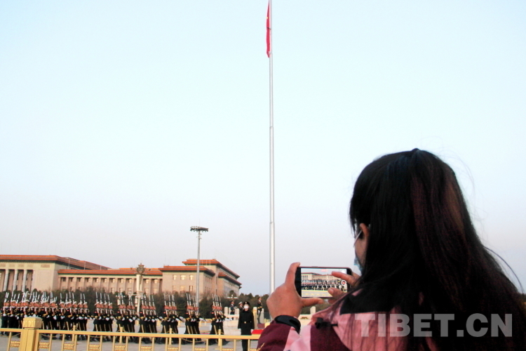 清晨6時(shí)許,軍樂團(tuán)在天安門廣場(chǎng)就位?!罢阶?!”隨著一聲響亮的口令,國(guó)旗護(hù)衛(wèi)隊(duì)邁著鏗鏘的正步,拱衛(wèi)國(guó)旗走過(guò)天安門城樓、金水橋?!跋驀?guó)旗敬禮!”6時(shí)9分,隨著響亮的口令,軍樂團(tuán)奏響了國(guó)歌《義勇軍進(jìn)行曲》,升旗手高高揚(yáng)起國(guó)旗,鮮艷的五星紅旗迎著朝陽(yáng)冉冉升起?!?023年西藏基層?jì)D聯(lián)干部赴京學(xué)習(xí)參觀團(tuán)”成員們紛紛用手機(jī)記錄下這難忘的時(shí)刻。
