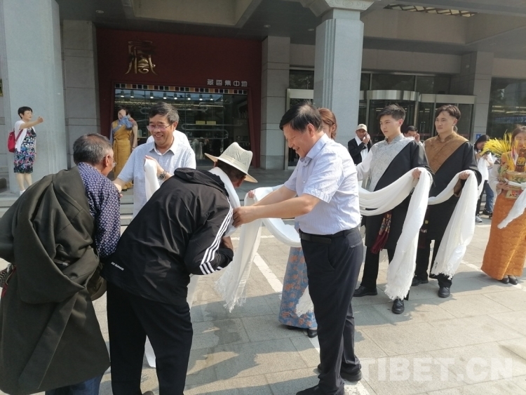 圖為北京建藏援藏工作者協(xié)會相關(guān)負責人為西藏村居兩委基層干部赴京考察學(xué)習(xí)團獻上哈達 攝影:王茜
