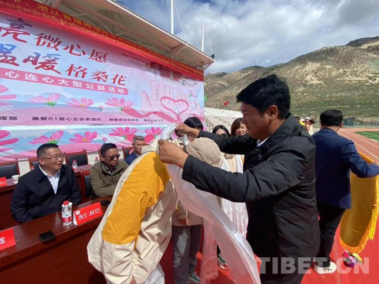 中國西藏網(wǎng)訊 6月19日,浙江金華市惠聚61愛心企業(yè)家團(tuán)隊萬里送愛心,在西藏森布日中學(xué)舉行“點亮微心愿·溫暖格?;ā惫婊顒?。