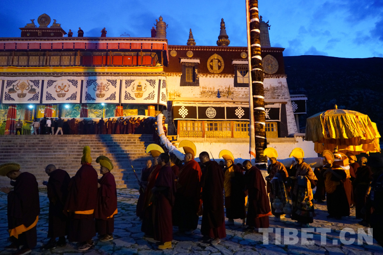 天還未亮,在哲蚌寺措欽大殿內(nèi),僧人們已早早準(zhǔn)備,做好展佛前的各項(xiàng)工作。伴隨著措欽大殿內(nèi)低沉的誦經(jīng)聲、大殿外長(zhǎng)鳴的法號(hào)和齊響的法螺,許多青壯年僧人將巨幅唐卡卷軸呈蛇形緩緩抬出大殿,朝著哲蚌寺后山前進(jìn),不少群眾主動(dòng)加入,共同參與這一時(shí)刻。