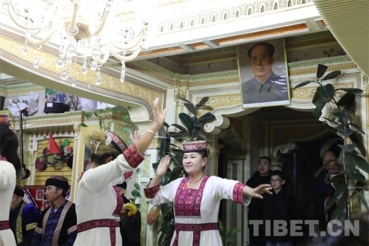 一路前行,在喀什地區(qū)澤普縣的布依魯克塔吉克風情小鎮(zhèn),美輪美奐的獨棟小院是小鎮(zhèn)居民區(qū)的特色,在夕陽的映襯下顯得格外溫馨舒適。好客的塔吉克族老人巴哈爾古麗·熱扎熱情地邀請走訪團一行前往家里做客。穿過小院,一進客廳就看見門廳上方懸掛著的毛主席畫像。當所有人落座后,鷹笛聲響起,身穿塔吉克民族服飾的人們開始翩翩起舞,充滿了載歌載舞的歡樂氣氛。