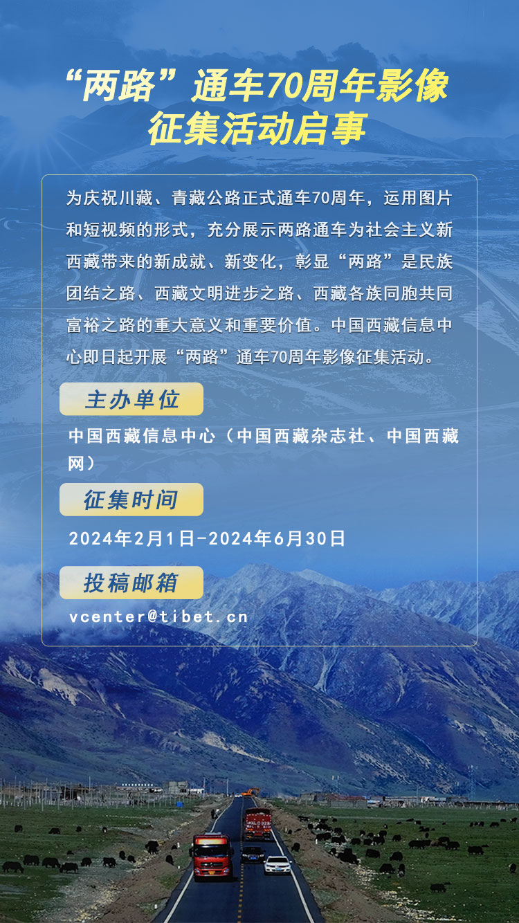 為慶祝川藏、青藏公路正式通車70周年,運用圖片和短視頻的形式,充分展示兩路通車為社會主義新西藏帶來的新成就、新變化,彰顯“兩路”是民族團(tuán)結(jié)之路、西藏文明進(jìn)步之路、西藏各族同胞共同富裕之路的重大意義和重要價值。中國西藏信息中心即日起開展“兩路”通車70周年影像征集活動。