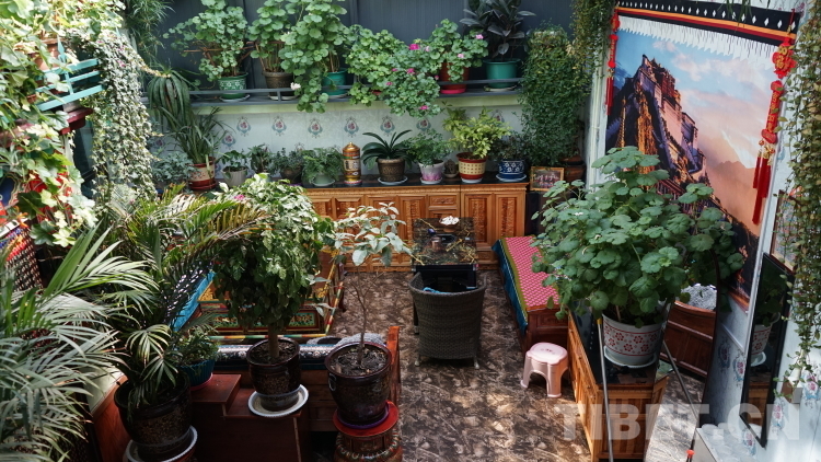 德瓊家庭旅館以女主人次仁德瓊的名字命名。工作人員告訴我們,這里是拉康鎮(zhèn)生意最好的旅館之一。旅館位于兩條主干道交接的拐角,地理位置好,招牌也立得醒目,每個(gè)進(jìn)入鎮(zhèn)子的人第一眼就能看到德瓊家庭旅館的招牌。但生意好絕不僅僅是因?yàn)榈乩砦恢脙?yōu)越。走進(jìn)這間旅館,如同進(jìn)入一間溫室花棚。在這里,花草植物是絕對(duì)的主角,各色草本、藤本、灌木植物高低錯(cuò)落,幾乎填滿了墻壁空間。蕭瑟的冬日里,粉的、白的、紅的花朵擠擠挨挨地開著,茉莉、山茶、三角梅...來(lái)自不同地域的花卉植物在這邊境小鎮(zhèn)的一隅競(jìng)相綻放,天南海北在此握手言和。德瓊阿佳用她對(duì)生活的熱情將家庭旅館裝點(diǎn)得生機(jī)盎然,我想正是這份純真的熱愛(ài)才是德瓊家庭旅館生意火爆的關(guān)鍵所在。