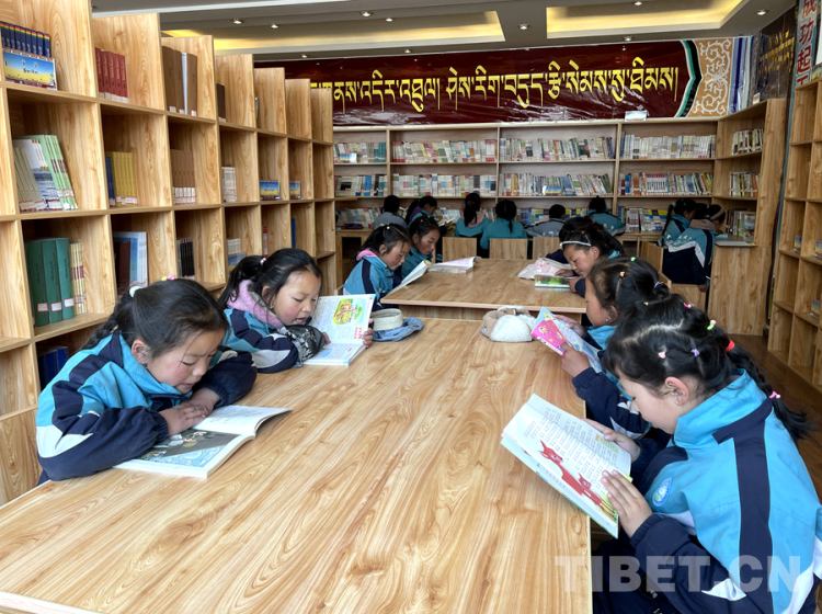 圖為4月23日,在西藏日喀則市薩迦縣雄麥鄉(xiāng)中心小學(xué)圖書(shū)館內(nèi),小學(xué)生們?cè)陂喿x書(shū)籍 攝影:頓珠次仁