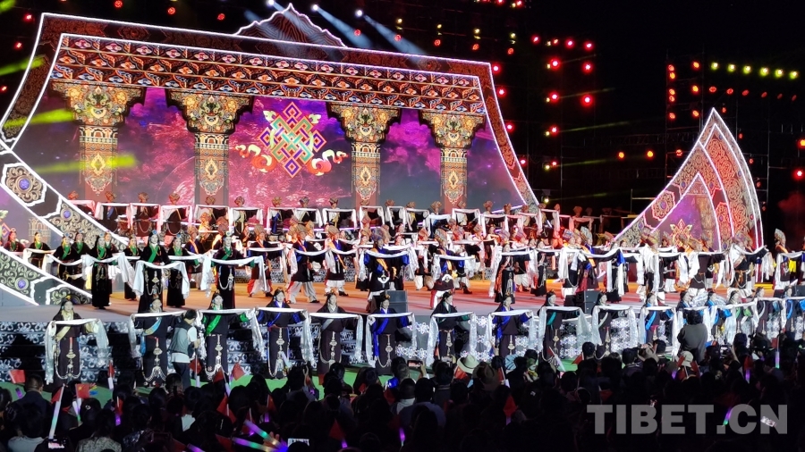 現(xiàn)場(chǎng)舞臺(tái)以藏族傳統(tǒng)手工藝品火鐮為造型,富有創(chuàng)造力地展示出盛德白玉的人文內(nèi)涵。演出現(xiàn)場(chǎng),由省級(jí)非物質(zhì)文化遺產(chǎn)傳統(tǒng)舞蹈手指鍋莊改編的群舞《千年指舞鍋莊》一開(kāi)場(chǎng)就引起全場(chǎng)歡呼。情景歌舞《精神永存》以金沙江“白格”堰塞湖為背景,講述了白玉縣上下齊心、共同奮戰(zhàn),最終打贏了這場(chǎng)應(yīng)急救援戰(zhàn)的故事,彰顯了白玉兒女團(tuán)結(jié)奮進(jìn)、敢作善為的白玉精神。來(lái)自白玉縣登龍鄉(xiāng)的群眾身著本地傳統(tǒng)服飾,表演了非物質(zhì)文化遺產(chǎn)——登龍“卓欽”。男子步法粗狂豪邁、英勃?jiǎng)偨?,唱腔渾厚、嗓音?dòng)人;女子舞蹈動(dòng)作步法細(xì)膩傳神、輕盈瀟灑,唱腔明亮婉轉(zhuǎn)、嗓音甜美動(dòng)人以及原始古樸,舞姿舒展,節(jié)奏明快,在舞步舞姿上的舒緩和節(jié)奏上的緩進(jìn),于粗獷中更沉穩(wěn),于質(zhì)樸中透中變化,在配男女對(duì)唱的優(yōu)美歌聲,極具地方特色,讓現(xiàn)場(chǎng)觀眾直觀地感受到了非遺獨(dú)特的文化魅力,一聲聲歡呼和喝彩掀起陣陣高潮。