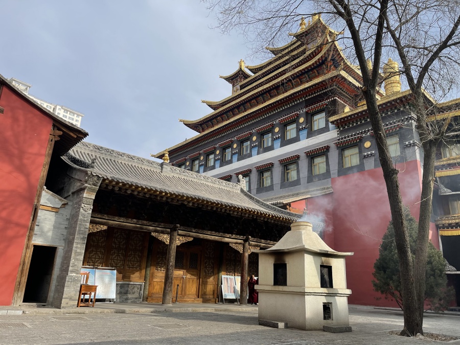 1951年12月15日,對班禪和堪廳的全體人員來說,這是個吉祥喜慶的好日子。據(jù)宋之樞先生回憶,那天天氣很冷,但班禪和堪廳人員早已恭候在宏覺寺山門前,每個人臉上都露出歡快喜悅的笑容。上午9時許,習仲勛同志乘車到達。陪同的有省委、省軍區(qū)的主要領導。班禪快步迎上去,與習仲勛緊緊握手,四目親切地對視好一會,才相互問候安好。老朋友久別重逢的氣氛,熱烈真誠。班禪陪習仲勛同志從喇嘛鼓樂隊和班禪警衛(wèi)隊所組成的儀仗隊通道中緩步走進宏覺寺山門,現(xiàn)場氣氛極為熱烈喜慶和莊嚴。