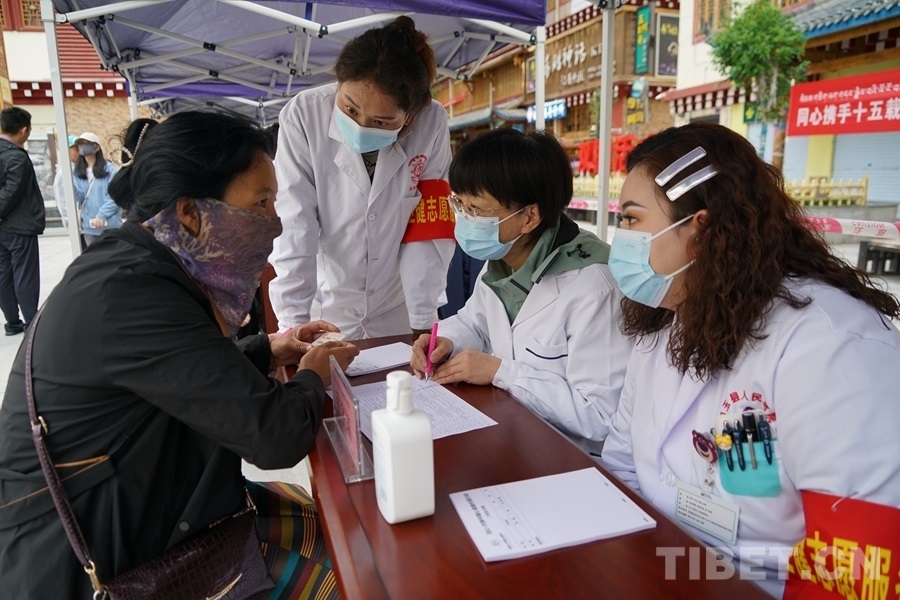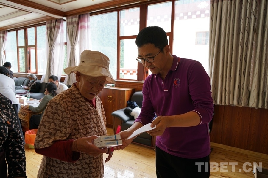 得知有來自北京的醫(yī)療專家為大家義診,家住白玉縣城的切呷一大早便帶著父母來到了義診現(xiàn)場(chǎng)。她的母親澤仁拉嘎今年75歲,自述下肢從腰間、腿部到腳尖都會(huì)發(fā)麻、有疼痛感,行走時(shí)腰部會(huì)很累,偶爾還會(huì)因?yàn)榭刂撇缓猛炔炕顒?dòng)而摔倒。北京水利醫(yī)院創(chuàng)傷骨科副主任醫(yī)師王耀輝在經(jīng)過詳細(xì)問診后,為拉嘎阿媽開具了營養(yǎng)神經(jīng)的藥品,并建議她進(jìn)一步做胸椎和腰椎方面的檢查。