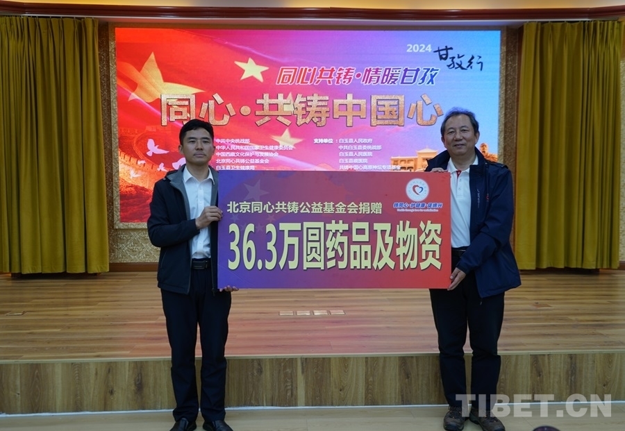 會議開始,與會人員一同觀看了“同心共鑄·情暖甘孜——‘同心·共鑄中國心’2024甘孜行”活動直播。隨后,白玉縣委書記劉堰,專家團(tuán)團(tuán)長、清華長庚醫(yī)院神經(jīng)外科主任醫(yī)師王貴懷分別致辭?,F(xiàn)場還舉行了捐贈儀式和授旗儀式。
