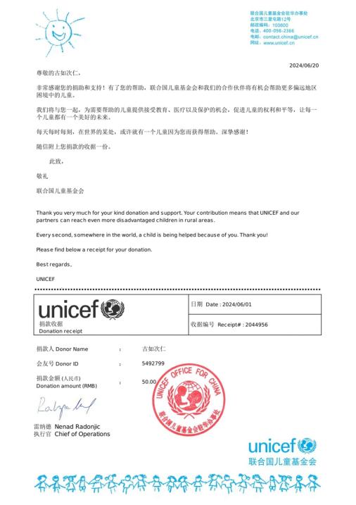 “之后的每個(gè)月我都會(huì)把省吃儉用節(jié)約下來的錢捐贈(zèng)給聯(lián)合國(guó)兒童基金會(huì),雖然每月捐贈(zèng)的金額數(shù)不大,但我這幾年一直力所能及地堅(jiān)持做著這件事?!惫湃绱稳收f,到大學(xué)后每月還有勤工儉學(xué)的收入,所以我會(huì)繼續(xù)堅(jiān)持做這件事,能通過自己的方式幫助到貧困兒童非常有意義。