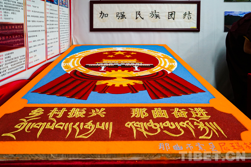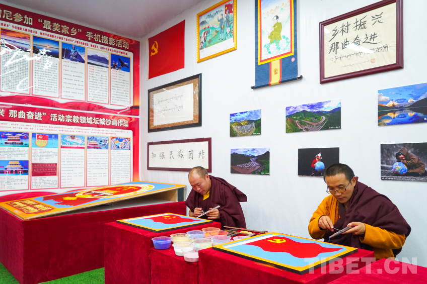 中國(guó)西藏網(wǎng)訊 2024年那曲恰青賽馬節(jié)暨第三屆“鄉(xiāng)村振興 那曲奮進(jìn)”活動(dòng)現(xiàn)場(chǎng),兩位來(lái)自那曲市索縣加勤鄉(xiāng)尼瑪林寺的僧人用彩砂繪制工藝?yán)L制黨徽、國(guó)旗、國(guó)徽等彩砂作品,深切表達(dá)藏傳佛教僧人愛(ài)黨愛(ài)國(guó)愛(ài)教之情,用實(shí)際行動(dòng)踐行聽黨話、感黨恩、跟黨走,加深信教群眾對(duì)于祖國(guó)的熱愛(ài)。