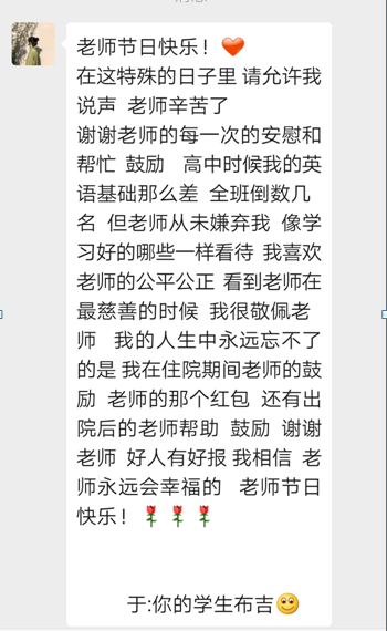 上大學(xué)時,?我?guī)е鴱哪抢飳W(xué)到的堅韌和自信,?踏入了這個全新的世界。?雖然大學(xué)生活與高中截然不同,?挑戰(zhàn)也更多,?但我始終記得您的教誨,?知道只要努力,?就沒有什么是不可能的。??每當(dāng)遇到困難,?我都會告訴自己,?就像您曾經(jīng)幫助我克服英語難題一樣,?我也能在這里找到屬于自己的路,于是更加堅定了前進的決心。?