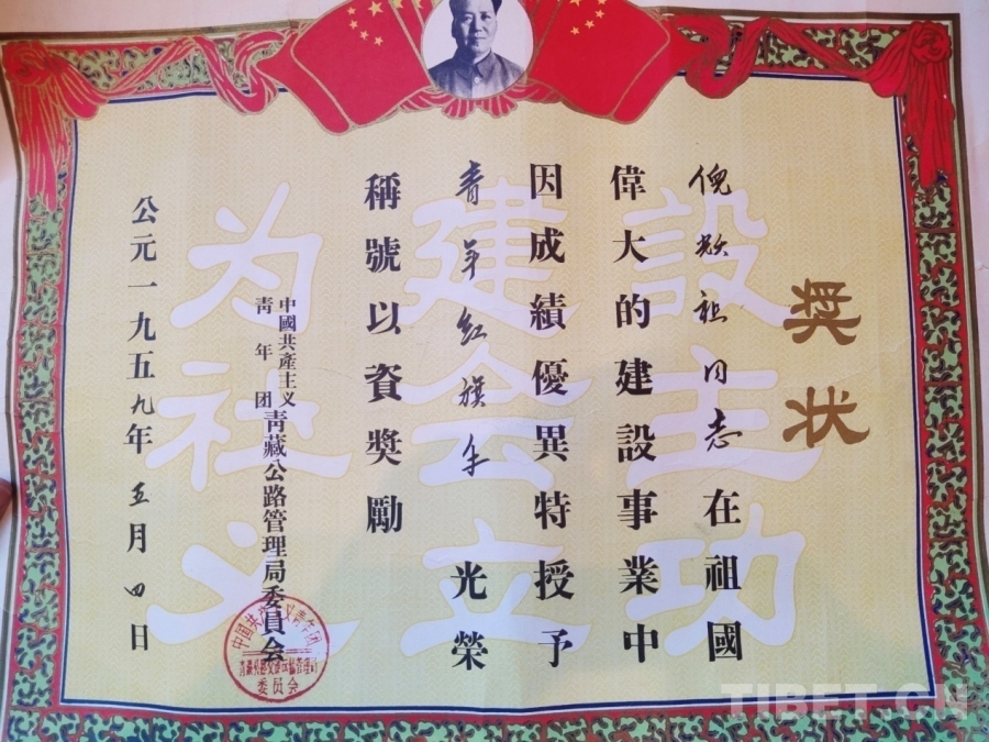 圖為1959年,中國(guó)共產(chǎn)主義青年團(tuán)青藏公路管理局委員會(huì)授予倪躍祖青年紅旗手光榮稱號(hào)的獎(jiǎng)狀