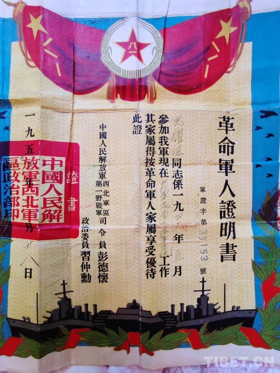 圖為中?國(guó)人民解放軍西北軍革命軍人證明書