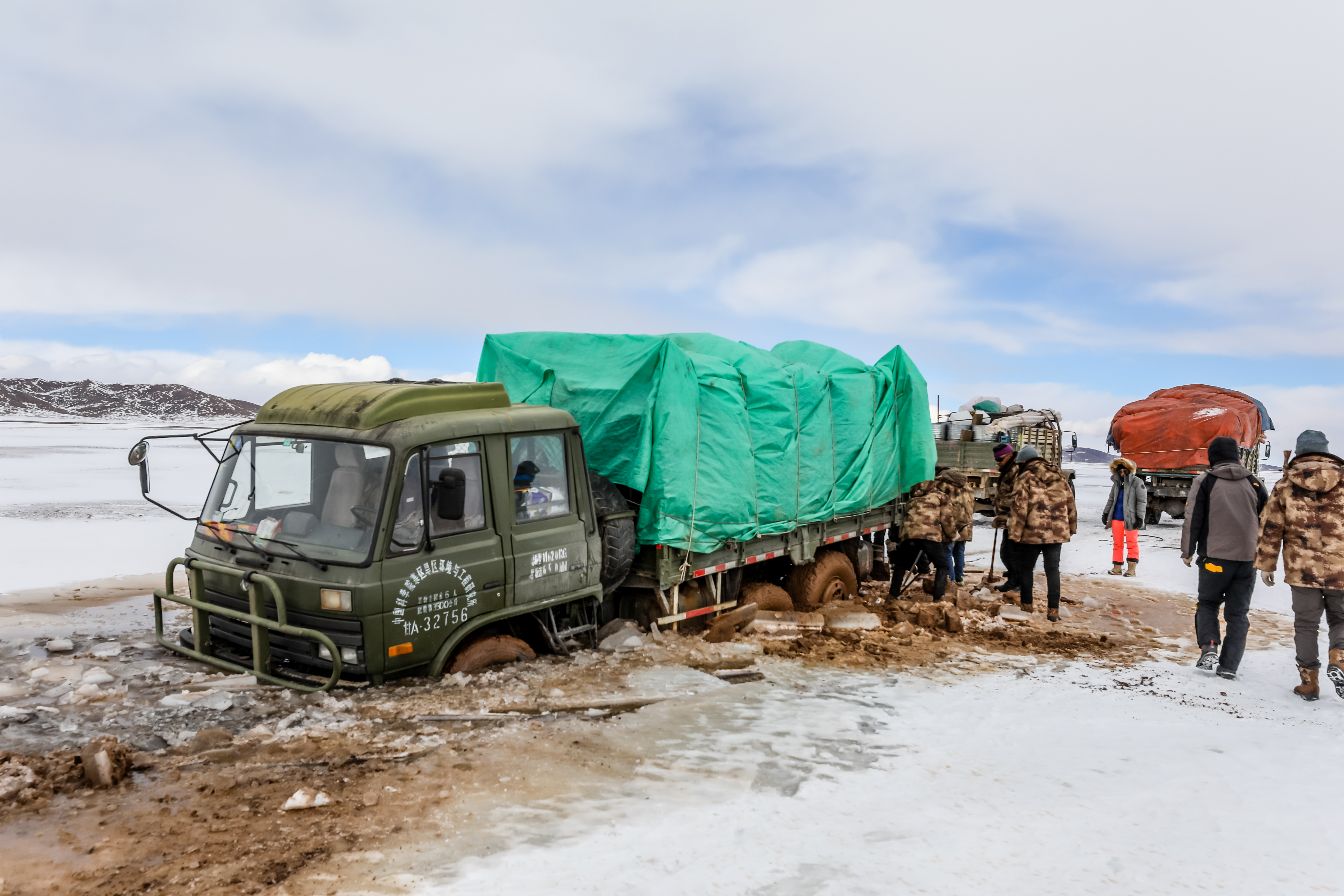 最后一次陷車臨近山的埡口,大雪掩蓋了尚未冰封凍實(shí)的小池塘。小型越野車通過后,大卡車順著車轍前行,深陷池塘。此時天已擦黑,狂風(fēng)呼嘯,科研人員只好把卡車上4噸的物品全部卸下,將車拖出,再進(jìn)行裝車?!傲阆率畮讛z氏度,5級風(fēng)的情況下,我們在那里折騰了4個小時?!?/p>