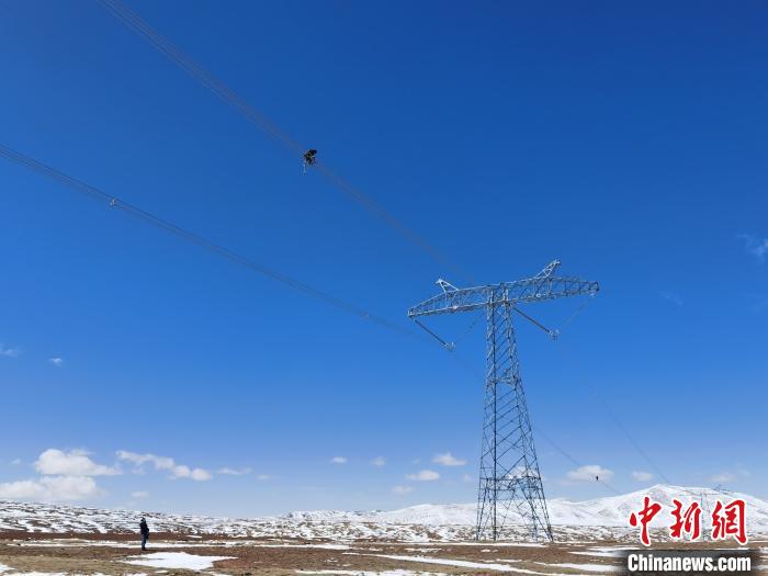 圖為5月13日,國網(wǎng)青海檢修公司輸電運檢人員在海拔五千米的風(fēng)火山地區(qū)對“電力天路”±400千伏柴拉直流線路進行空中走線巡檢,查找并消除線路缺陷。謝莉蓉 攝