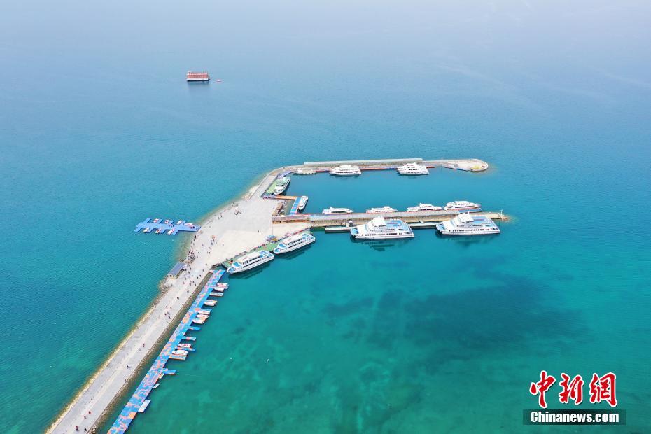 5月19日,航拍被碧綠湖水包圍的青海湖二郎劍景區(qū)碼頭。初夏時節(jié),青海省海南藏族自治州青海湖畔萬物復蘇,碧水藍天,宛如油畫。中新社記者 馬銘言 攝