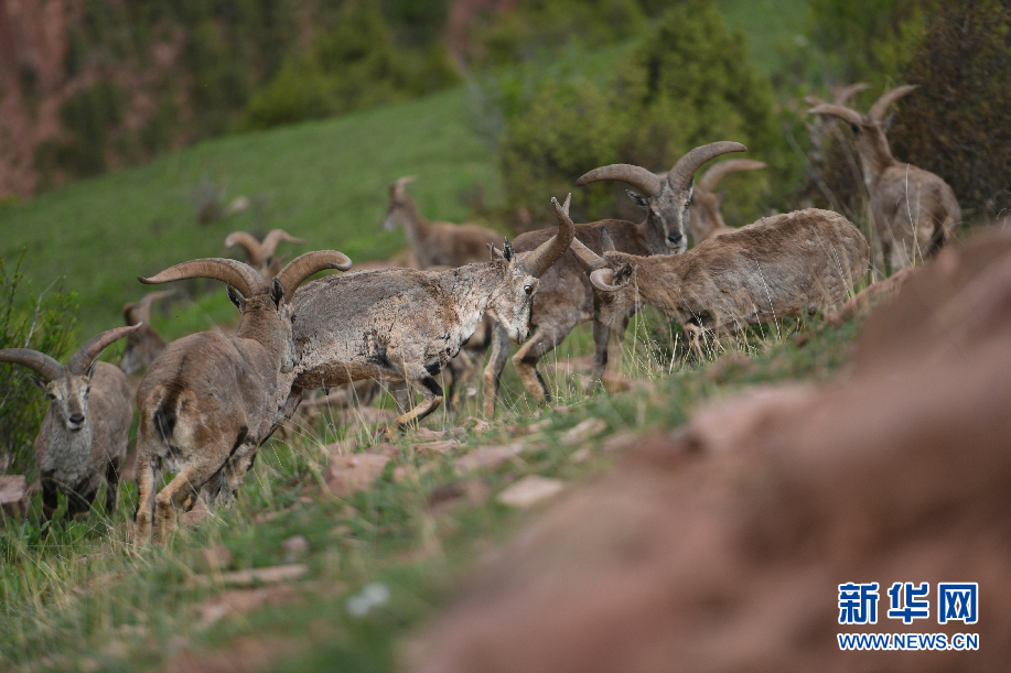 一群巖羊在青海省玉樹藏族自治州囊謙縣吉尼賽鄉(xiāng)河谷的山坡上嬉戲。(6月20日攝)新華網 潘彬彬 攝