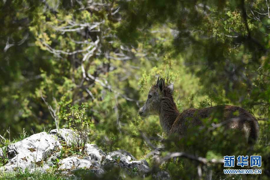 一只小巖羊在囊謙縣白扎鄉(xiāng)尕爾寺附近的山坡上覓食。(6月21日攝)新華網 潘彬彬 攝