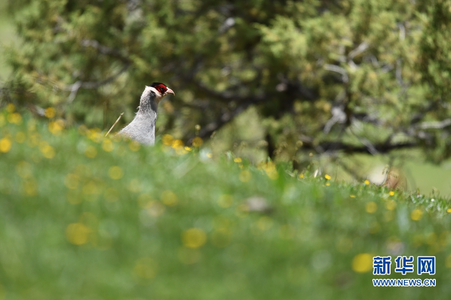 幾只白馬雞在囊謙縣吉尼賽鄉(xiāng)河谷的山坡上覓食。(6月20日攝)新華網 潘彬彬 攝