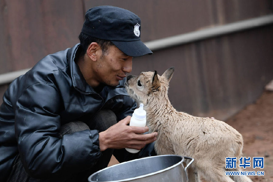 7月8日,三江源國家公園管理局長江源園區(qū)可可西里管理處卓乃湖保護(hù)站的工作人員才文多杰在給藏羚羊幼仔喂奶。新華社記者 張龍 攝