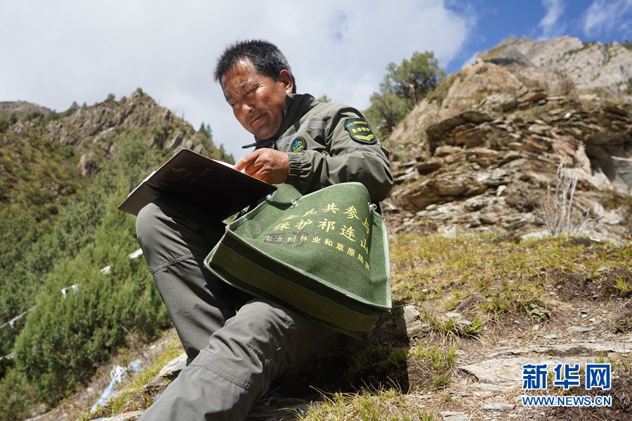 祁連山國(guó)家公園青海片區(qū)油葫蘆管護(hù)站的生態(tài)管護(hù)員王學(xué)清在記錄巡山情況(9月9日攝)。新華社記者 藍(lán)翔 攝