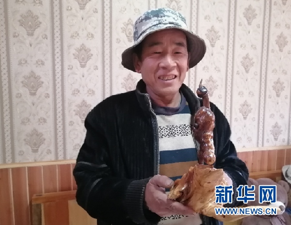 鬧加和他的樹雕作品。新華網(wǎng) 宋燕 攝