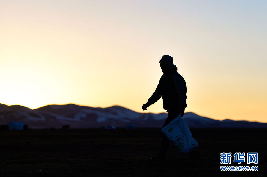 10月28日,在青海省玉樹藏族自治州稱多縣境內的嘉塘草原上,生態(tài)管護員扎西才文在撿拾垃圾。新華社記者 張龍 攝