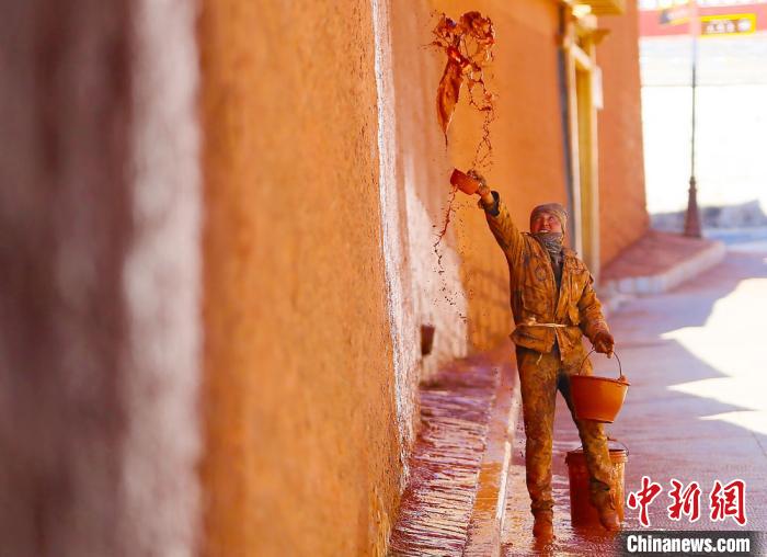 11月上旬,夏河縣拉卜楞寺內(nèi),匠人用傳統(tǒng)潑灑方法為寺院墻壁“美顏”?!「哒?攝