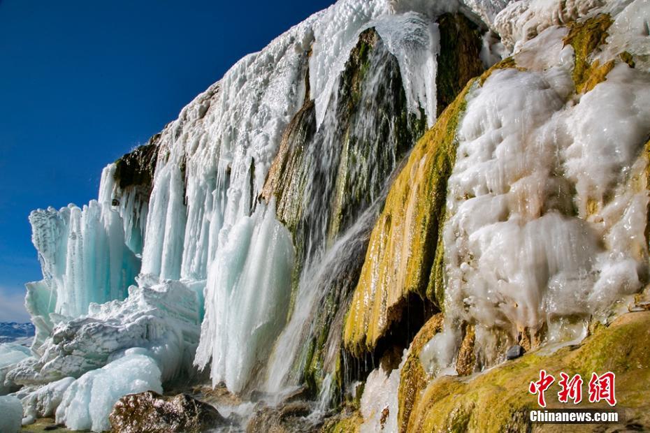 2021年1月23日,祁連山國家公園崗什卡雪峰山腳下的七彩冰瀑,由于溪水中含有多種礦物質(zhì),在冬日暖陽的照耀下,散發(fā)出五彩繽紛的綺麗風(fēng)光,蔚為壯觀。中新社發(fā) 成 林 攝