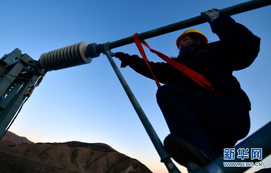 2月2日,在青藏鐵路公司西寧供電段哈爾蓋工區(qū)負(fù)責(zé)鐵路線上,羅露露在攀登接觸網(wǎng)支柱。新華社記者 張龍 攝