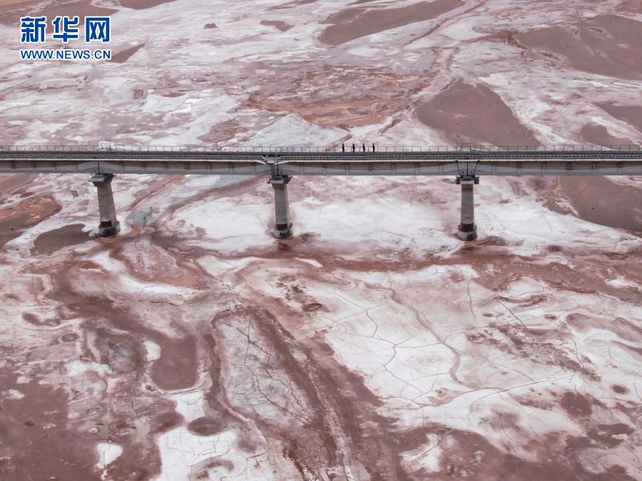 2月5日,沱沱河站派出所的巡線民警在青藏鐵路沱沱河大橋巡查(無(wú)人機(jī)照片)。新華社記者 張龍 攝