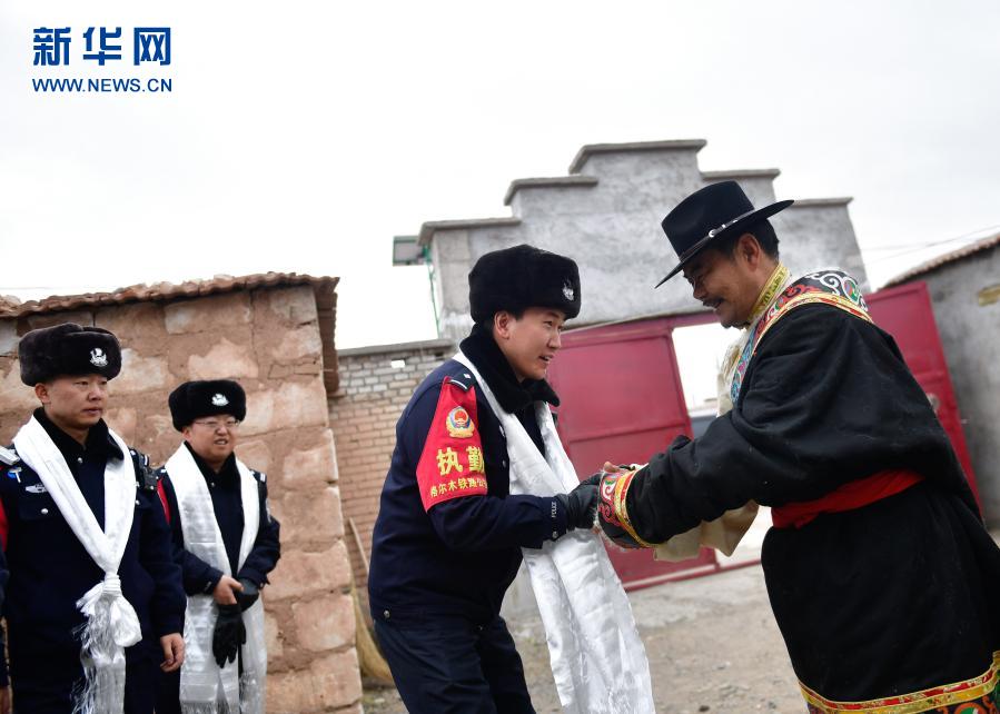 2月5日,沱沱河站派出所巡線民警到格爾木市唐古拉山鎮(zhèn)格日村義務(wù)護(hù)路隊(duì)員革命花(右一)家中慰問(wèn)時(shí)接受哈達(dá)。新華社記者 張龍 攝