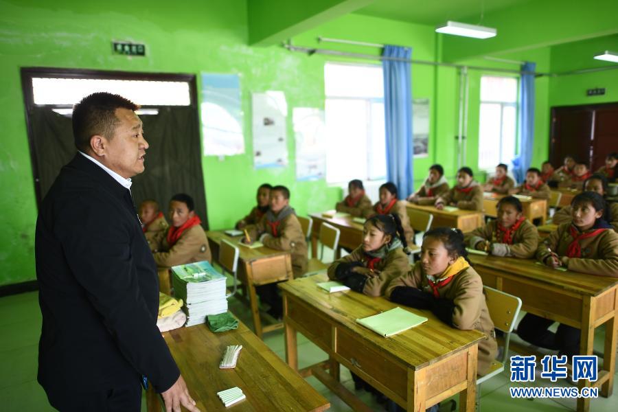 3月23日,索南旦正(左)在吉尕小學(xué)青少年生態(tài)道德教育基地授課。新華社記者 張宏祥 攝