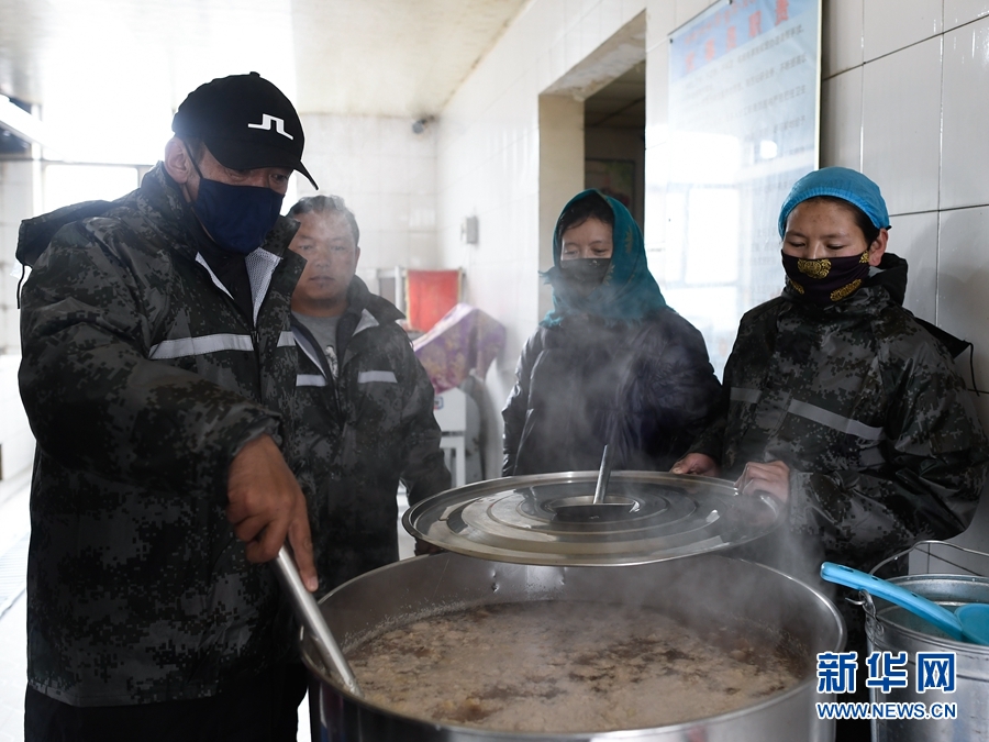 5月22日,在瑪多縣黃河鄉(xiāng)寄宿制學(xué)校救災(zāi)安置點,老師們在給學(xué)生制作肉粥。新華社記者 張龍 攝