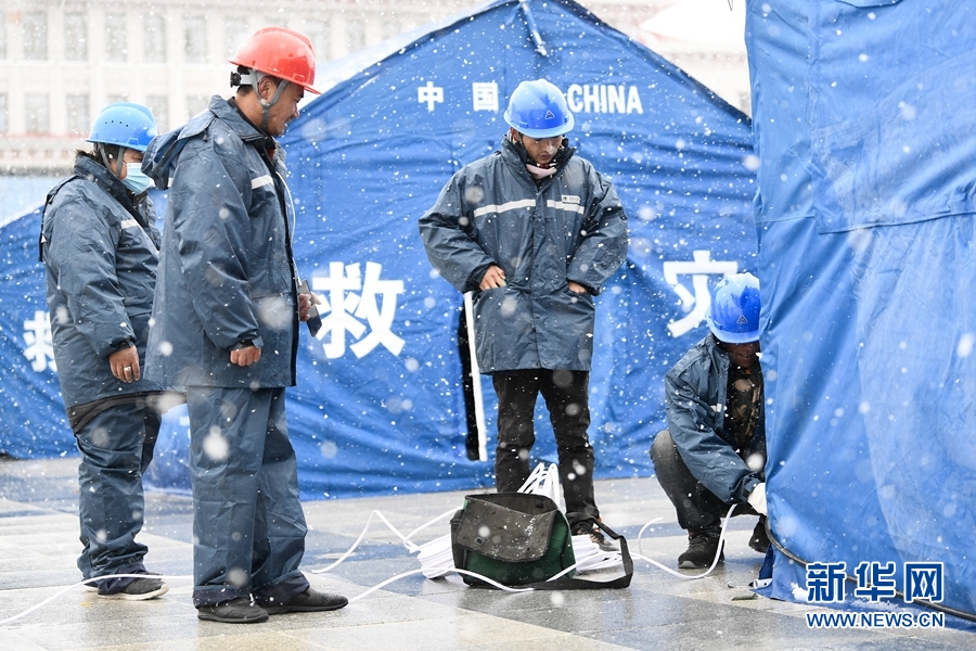 為了點亮災(zāi)區(qū)首夜,國家電網(wǎng)青海省電力公司組織143名應(yīng)急搶修人員,爭分奪秒為安置點通電。