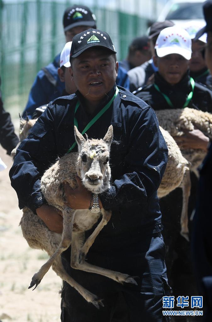 7月7日,在可可西里索南達(dá)杰保護(hù)站野生動物救助中心,可可西里巡山隊員按照風(fēng)俗為放歸的藏羚羊戴上哈達(dá)表達(dá)祝福。新華社記者 張龍 攝
