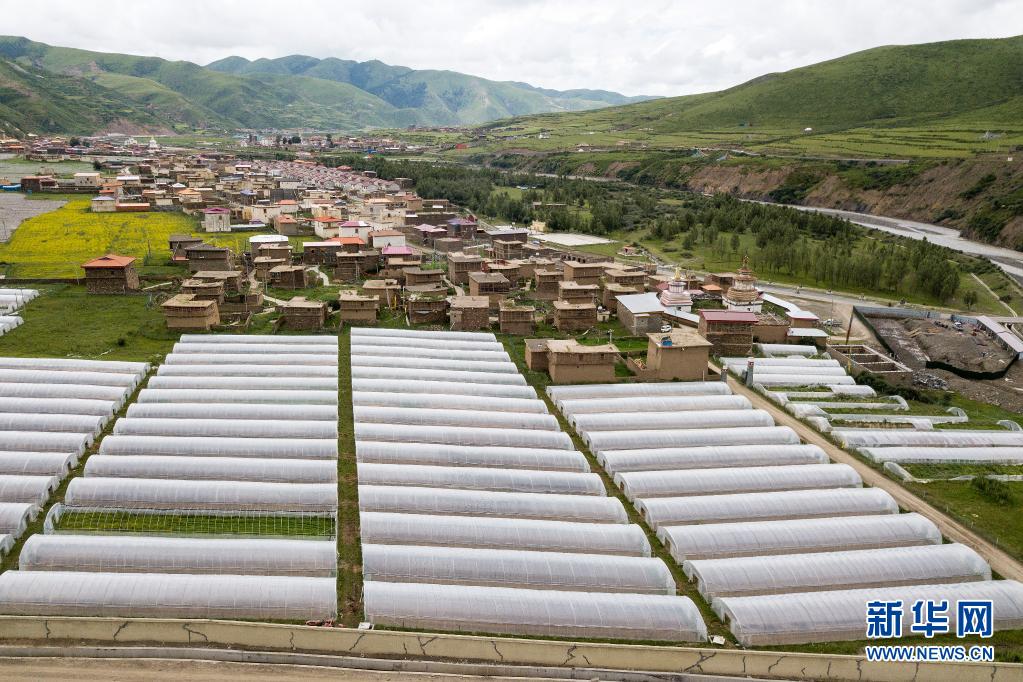壤塘縣瑟谷村蔬菜基地內(nèi)的蔬菜大棚(7月17日攝,無人機照片)。新華社記者 李鑫 攝