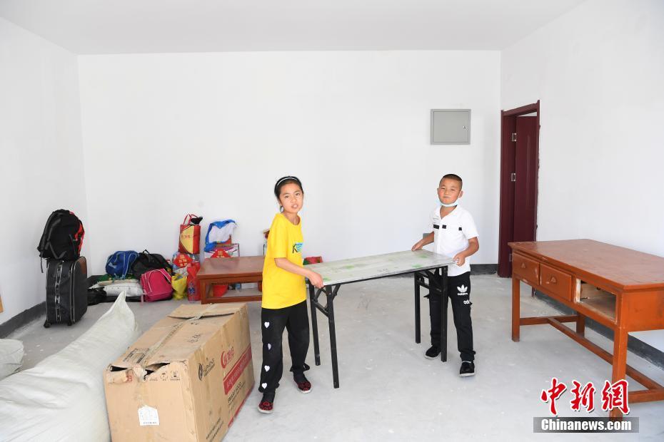 8月7日,甘肅省舟曲縣首批60戶289名地質(zhì)災(zāi)害避險搬遷村民到達蘭州新區(qū)并入住,11歲小女孩虎紅霞和弟弟在新家內(nèi)整理家具。甘肅舟曲縣啟動地質(zhì)災(zāi)害避險搬遷工作,第一批次60戶289人集中告別故土,乘車前往數(shù)百公里之外的蘭州新區(qū)。 中新社記者 楊艷敏 攝